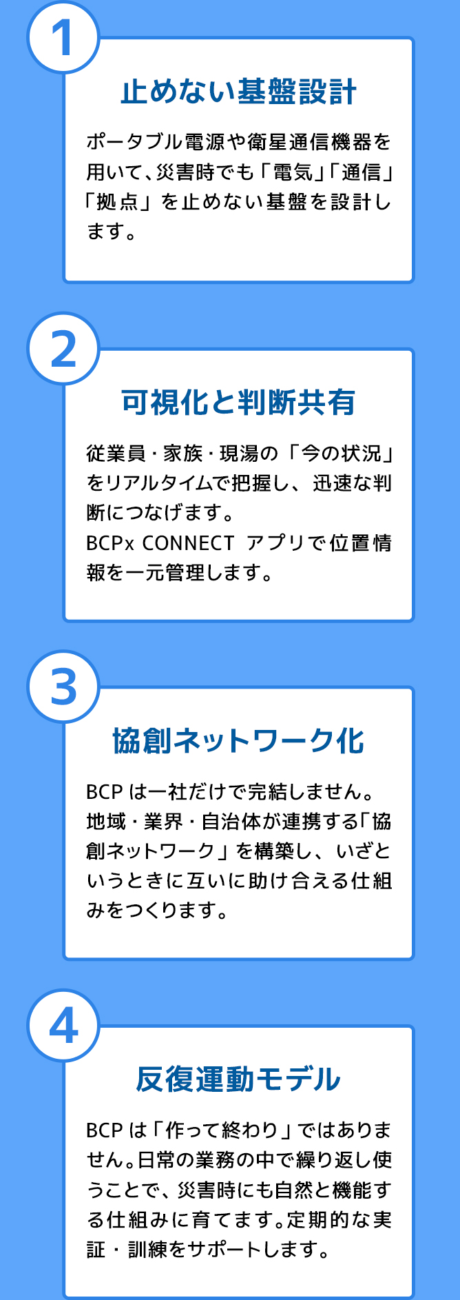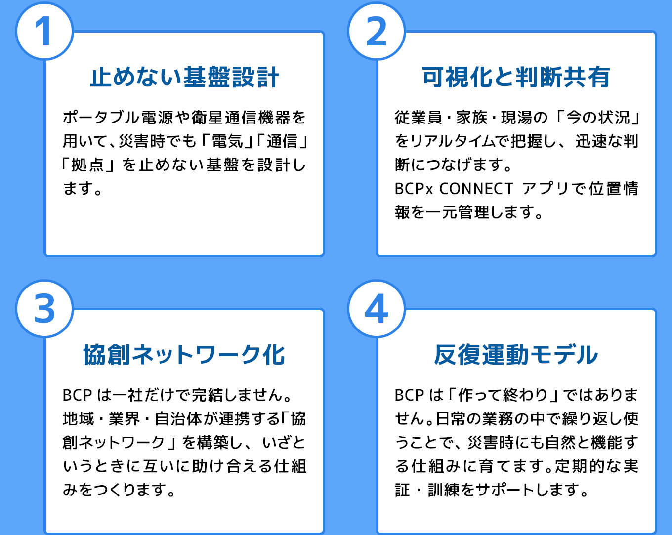 BCPx は、「止まらない仕祖み」を設計するための4層構造のプラットフォームです。どこか1 つから始めることも、全体を統合することも可能です。